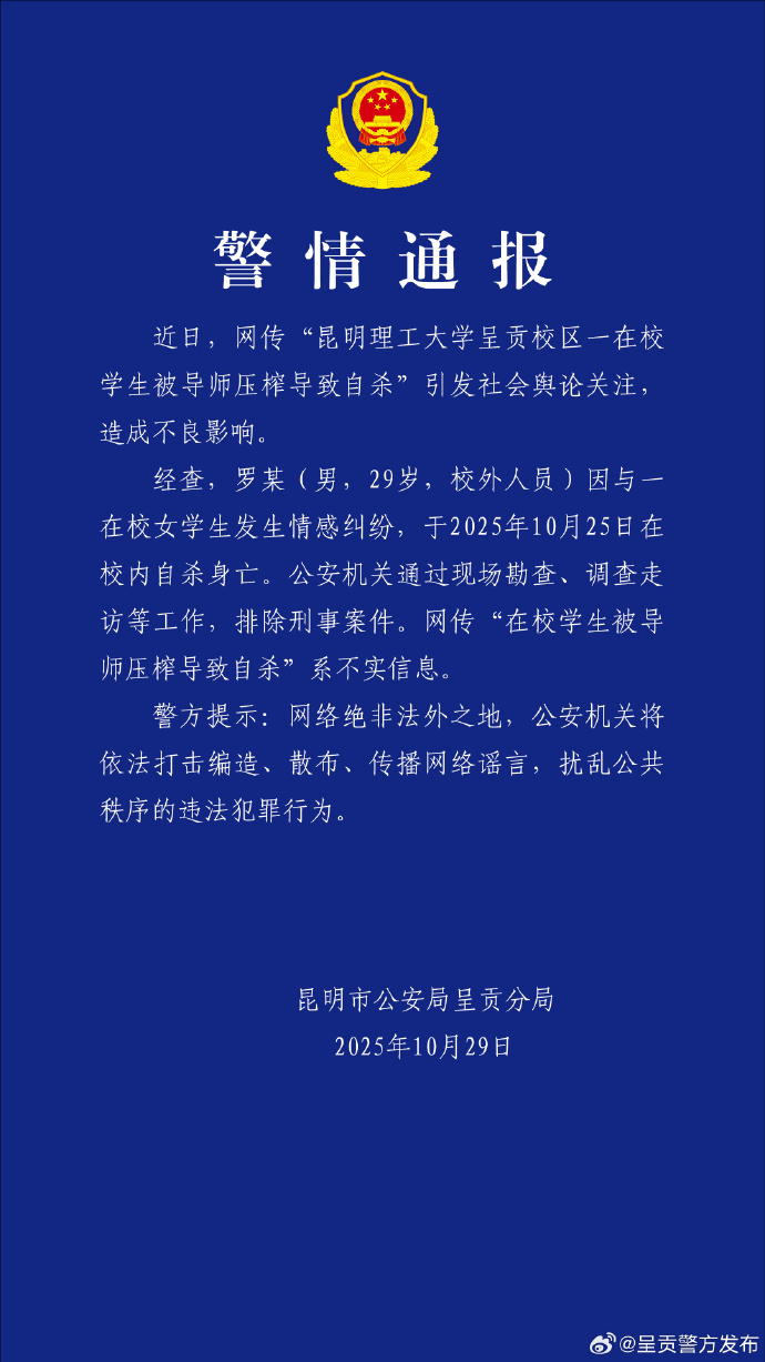中国经济网版权所有 中国经济网新媒体矩阵 网络广播视听节目许可证(0107190)(京ICP040090) 央视网消息:据@成功警察微博新闻,昆明市公安局呈贡分局10月29日报道,近日,网络传言“昆明理工大学呈贡校区一名学生被导师殴打自杀”的谣言引起社会关注并造成不良影响。经查,罗某(男,29岁,休学)因在校与一名女学生发生感情纠纷,于2025年10月25日在校园内自杀。公安机关通过现场检查、走访调查等工作消除刑事案件。这是网上流传的“该校学生被导师压榨自杀”的不实信息。