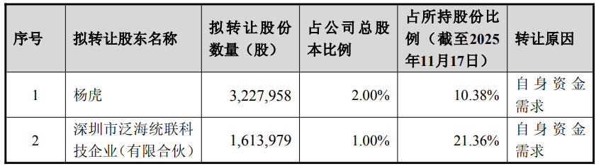 中国经济网北京11月18日讯:通联精工(688210.sh)昨日晚间披露股东问询及转让预案。公司控股股东、实际控制人杨虎及其关联方深圳市泛海通联科技企业(有限合伙)(以下简称“转让方”)拟转让股份共计4,841,937股,占公司总股本的3.00%。本次询价转让不通过集中竞价交易或大宗交易方式进行,也不包含通过二级市场减持。受让人向股东查询的转让股份,在转让后6个月内不得转让。本次转让询价的受让方为机构投资者具有适当定价能力和风险承受能力的投资者。转让方委托中信证券股份有限公司(简称“中信证券”)安排并执行本次转让询价。以通联精密11月17日收盘价52.55元计算,杨虎及一致行动人释放现金金额约为2.54亿元。 2025年9月5日,通联精密晚间披露,控股股东、实际控制人及一致行动人股权变动达到1%大关,并公告减持计划完成情况及减持结果。公司收到杨虎、泛海通联(合伙)出具的《关于影响1%规模及股份减持结果的股权变动通知函》。截至2025年9月5日,通过集中竞价及区块交易方式累计减持公司股份4.807239股,减持比例不超过3%。f 公司总股本。上述股东减持计划为自2025年9月2日至2025年9月5日,杨虎及一致行动人持有公司股份总数由54,010,754股减少至49,203,515股,持股比例由33.71%减少至30.71%,持有整数倍为1%。本次权益变动系公司股东实施此前披露的减持计划所致,不涉及要约收购。本次股权变动不会导致公司股东及实际控制人控制权发生变化,不会对公司管理架构和未来持续经营产生重大影响。杨虎为控股股东,将实际控制通联准确。深圳市智易企业管理咨询有限公司,深圳市普特科技企业(有限合伙)、海维科技普通合伙人e通联(合伙)是杨虎100%持股的公司。公告显示,杨虎合计减持金额为133,716,890.89元,泛海通联(合伙)合计减持金额为42,401,826.23元,合计1.76亿元。 2025年前三季度,通联精密实现营业收入6.42亿元,同比增长8.38%;归属于上市公司股东的净利润575.71万元,同比下降88.94%;归属于上市公司股东的非净利润284.25万元,同比下降94.67%;经营活动产生的现金流量净额1.31亿元,同比下降88.94%,同比增长11.18%。通联精密于2025年10月14日公告了发行不特定项目可转换公司债券的招股说明书(申请草案)。y 公司本次发行的可转债规模不超过5.95亿元(含原金额)。扣除生产成本后,将用于新部件智能终端(轻材料)智能制造中心项目,增加流动资金和偿还银行贷款。公司本次发行的可转换公司债券属于集体评级。其中,发行人一级信用评级为“aa-”,本次公司可转债信用评级为“aa-”,评级展望为稳定。通联精密于2021年12月27日在上海证券交易所科创板上市,公开发行新股2000万股,发行价格为42.76元/股。保荐机构(主承销商)为国金证券,保荐代表人为朱国民、刘太川。通联精密上市首日盘中最高价52.80元,上市第二天就破价了。通联精工首次公开发行股票募集资金8.55亿元,募集资金净额7.73亿元,比原计划资金减少1.25亿元。通联精密此前在招股书中披露,公司原计划募集资金8.98亿元,拟用于湖南长沙MIM产品(电子产品零部件)生产基地建设项目、泛海研发中心建设项目以及补充流动资金项目。通联精密首次公开发行股票发行费用总额为8234.79万元(不含增值税),其中保荐及承销费用6058.53万元。通联精密于2023年5月18日发布了2022年度股权分配实施公告,本次分配及收益分配以公司总股本为基础方案实施前增资11,200万股,每股派发现金红利0.2股。 6元(含税),以资本公积金向全体股东转增0.4股。共派发现金股利2,912万元,转股4,480万股。本次分配后的总股本为15,680万股。通联精密2022年6月7日公告显示,公司利润分配及转增股本以预案实施前公司总股本8000万股为基数,每股派发现金红利0.2元(含税)。公积金向全体股东每股转增0.4股,共计派发现金红利16,000,000.00元,转让股份32,000,000股。本次分配后,总股本为112,000,000股。