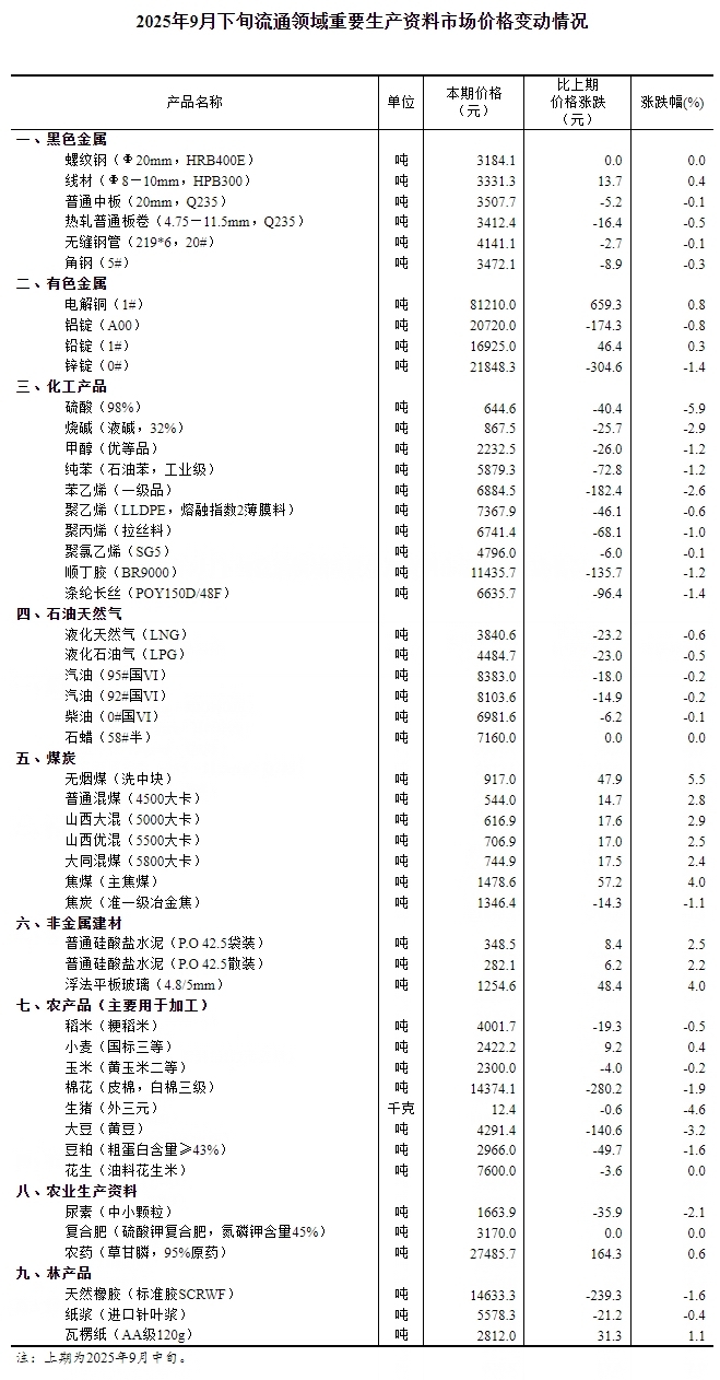 2025年9月下旬流通领域重要生产方式市场价格变动