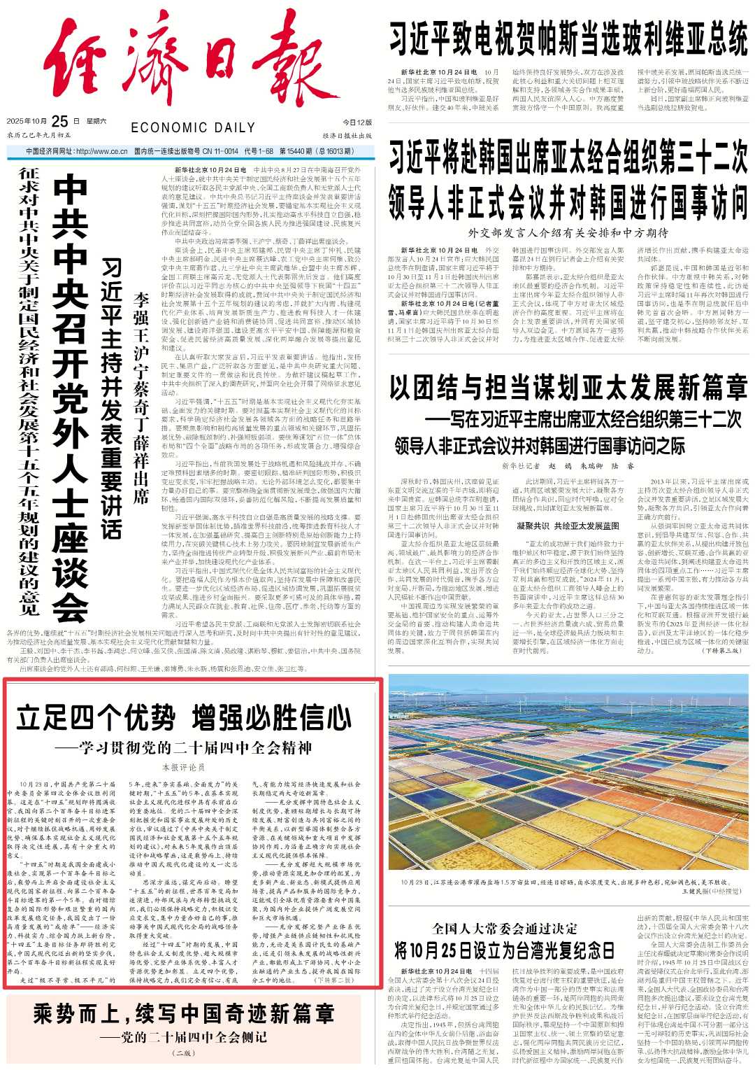 近日,该报连续发表评论员六篇文章,分析贯彻党的二十届四中全会精神。来看看↓基于四大优势,增强成功信心。 10月23日,中国共产党第二十届中央委员会第四次全体会议胜利闭幕。这是在“十四五”规划即将圆满结束、我国开启第二个百年奋斗目标新征程的关键时刻召开的一次重要会议。对于继续抢抓战略机遇、充分利用发展机遇、推动共同实现社会主义现代化事业取得决定性进展具有重要意义。经过“十四五”发展,中国特色社会主义制度优势、超大市场优势、门类齐全的产业体系优势、丰富的人力资源优势更加凸显。这四种优势不仅是叠加的,而是一个有机的整体。在组织动员能力、总体协调能力上,引导资源要素在重点领域联合起来,为发展超大规模市场优势、增强产业体系动能、释放人力资源要素活力提供坚实的制度保障;超大规模市场优势与完整产业优势的结合l 制度推动形成供给与需求相互促进的良好局面,拓展结合重要路径,扩大高质量发展体系优势;制度优势、市场优势、产业优势的实现和发展取决于人才,人才是技术创新、制度创新、管理创新的最终源泉。 → 点击阅读全文《立足四大优势增强决胜信心——学习贯彻党的二十届四中全会精神》坚定不移推动高质量发展党的二十届四中全会在《规划纲要》中对高质量发展作出了新的部署,强调以推动高发展为主题,把高质量发展作为遵循的原则,明确了实现高质量发展的目标。质量发展第一马取得惊人成绩在目标中。高质量发展不仅需要资源配置的高效率,还需要科技自力更生、共同繁荣、可持续发展等诸多要求。需要将“有效的市场”与“有为的政府”有机结合起来,制定相应的体制机制。全会提出,加快建设高水平社会主义经济体系,增强高质量发展动力。这就要求推进和完善社会主义基本经济制度,更好发挥经济体制改革的引领作用,运用“看不见的手”和“有形的手”,完善宏观经济管理体系,确保经济长期稳定高质量发展。 → 点击阅读原文《坚定不移推动高质量发展——学习贯彻党的二十届四中全会精神》全面推进强大国内市场建设。党的二十届四中全会提出“建设强大国内市场,加快构建新发展格局”,是“十五”期间集中力量做好自己事情的重要战略拓展。体现了宏观政策的延续性,也体现了解决难题的主动性。建立强大的国内市场还有很多工作要做。为破解痛点、破解堵点、排除障碍,党的二十届四中全会审议通过的《中共中央关于制定国民经济和社会发展第十五个五年规划的建议》明确了一系列行之有效的指导方针。坚持惠民生、促消费紧密结合,投资搞物、投资人,全方位扩大内需,开辟市场增长空间;深入实施促消费专项行动,保持投资合理增长,提高政府民生投资比重,有利于不断提高投资综合效益,促进消费与投资良性关系;统一市场基本制度规则、规范经济经济统一行为、统一市场监管和执法等,旨在更好打破“隐形墙”,彻底释放我国超大市场红利。 →点击阅读原文《全面推进强大国内市场建设——学习贯彻党的二十届四中全会精神》坚决促进全体人民共同富裕。读党的二十届中央委员会第四次全体会议公报。贯穿始终的一个“人民”二字,突出了坚持和建设中国特色社会主义的主体地位,以“生活富裕、精神自信自强、环境宜居宜业、社会和谐和谐、公共服务普遍普遍”为工作定位。即将到来的“十五”时期,是社会主义现代化建设重大投入、夯实基础、全力以赴的关键时期。这也是转型期结束后巩固扩大脱贫成果、有效对接乡村振兴的常态化帮扶新阶段。民生领域还有很多痛点、难点需要解决,还有很多“硬骨头”需要啃;人民对美好生活的向往将增添新内容时代进步的内涵。必须在推动高质量发展过程中坚定不移地推动全体人民共同富裕,不断推进中国式现代化。 →点击阅读原文《坚决主张全体人民共同富裕——学习贯彻党的二十届四中全会精神》让市场发挥更大作用、政府发挥更大作用,在确保社会主义现代化基本实现、确保社会充满活力、和谐发展方面取得决定性进展。关键是处理好政府和市场的关系,让市场在资源配置中发挥一定作用,更好发挥政府作用。为此,“坚持有效市场和有效政府相结合”成为经济社会发展必须遵循的原则“十五”期间。把市场作用和政府作用更好地结合起来,是一个不断完善基础、全力以赴的过程”,我们将面临更加复杂严峻的国际环境和更加艰难险阻的国内改革发展稳定工作,将面临更多可预见、不可预测的风险挑战。只有激发社会主义市场经济改革方向,让市场更有效,让政府更有效,才能促进我国经济稳定和长期发展。→点击阅读原文《让市场更有效》高效政府更有效——学习贯彻党的二十届四中全会精神《坚持发展和安全总体协调》《坚持发展和安全总体协调》是时候党的二十届中央全会提出“十五五”规划,这是我国未来经济社会发展必须遵循的六大原则之一,凸显了新形势下将安全发展融入各领域、融入国家发展全过程的重要性和紧迫性。实现高质量发展和高水平安全良性互动,既是应对内外部风险挑战的现实需要,也是促进经济平稳长期发展、服务国家战略大局的关键保障。真实而复杂的挑战考验着我们协调发展和安全的能力。当前,我国经济正处于“换挡转型”的关键